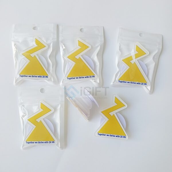 Popsocket mica thường được gia công bế nhân vật theo thiết kế riêng biệt, kết hợp cùng tag giấy in logo thương hiệu để tăng tính nhận diện. Ngoài ra, sản phẩm có thể được đóng gói trong túi OPP cao cấp, vừa đảm bảo tính thẩm mỹ, vừa giúp sản phẩm giữ được độ mới khi đến tay khách hàng.