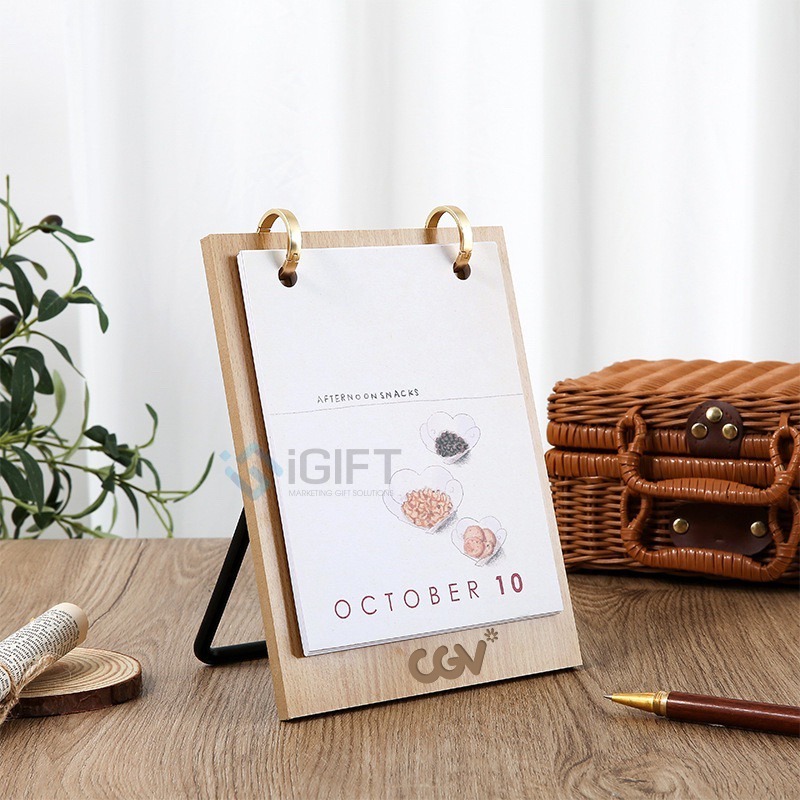 iGIFT cung cấp dịch vụ sản xuất lịch để bàn theo yêu cầu với số lượng từ 200pcs trở lên, hỗ trợ thiết kế, in ấn và khắc logo theo bộ nhận diện thương hiệu của từng doanh nghiệp. Toàn bộ quy trình được kiểm soát chặt chẽ về chất lượng, tiến độ và hình thức đóng gói.