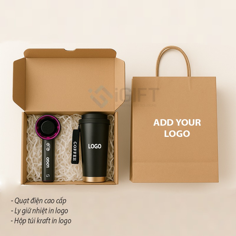 Sự kết hợp giữa quạt điện mini và bình giữ nhiệt trong hộp kraft không chỉ mang lại sự tiện lợi cho người nhận mà còn giúp thương hiệu hiện diện một cách tự nhiên, lặp đi lặp lại trong sinh hoạt hằng ngày. Đây là lựa chọn hoàn hảo cho quà tặng khách hàng, đối tác, quà tri ân nhân viên hay quà sự kiện. Đặc biệt, với dịch vụ in ấn đồng bộ, doanh nghiệp dễ dàng xây dựng hình ảnh thương hiệu nhất quán và chuyên nghiệp.
