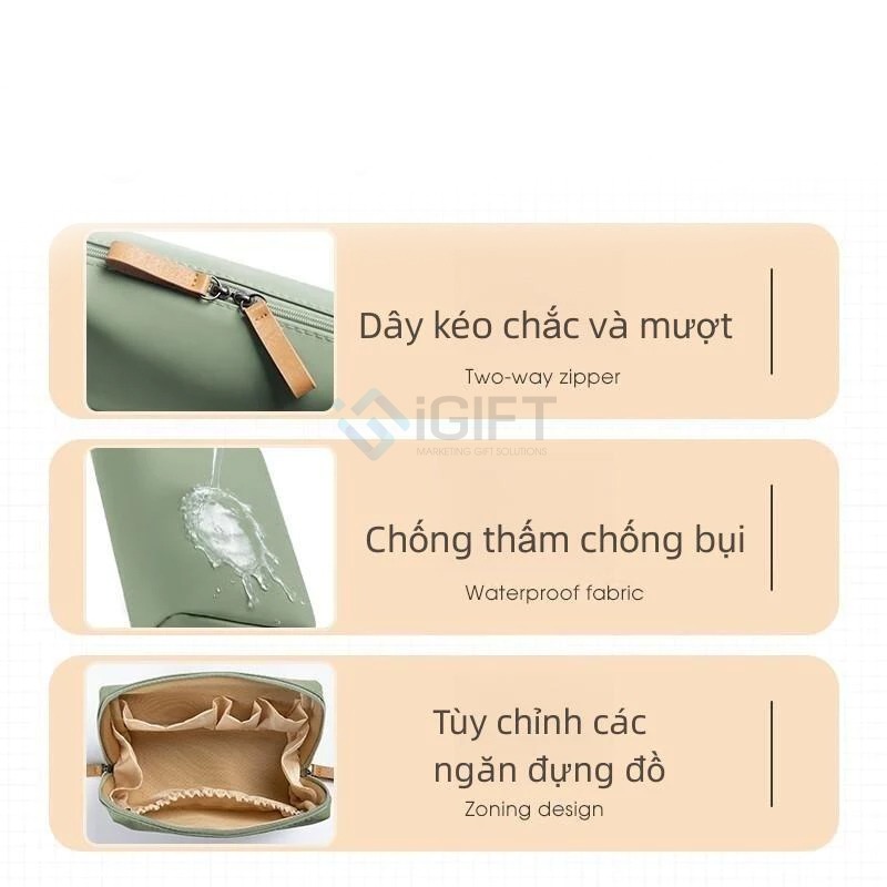 Tại iGIFT, chúng tôi chuyên cung cấp các mẫu túi đựng mỹ phẩm in logo theo yêu cầu với cam kết về chất lượng, tiến độ và giá cả. Với đội ngũ thiết kế sáng tạo và xưởng sản xuất uy tín, iGIFT sẵn sàng đồng hành cùng doanh nghiệp của bạn trong mọi chiến dịch marketing, tri ân khách hàng hay phát triển đại lý.