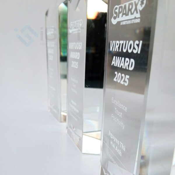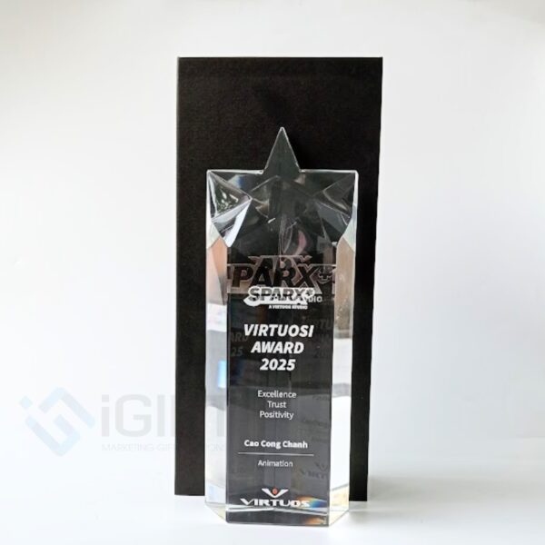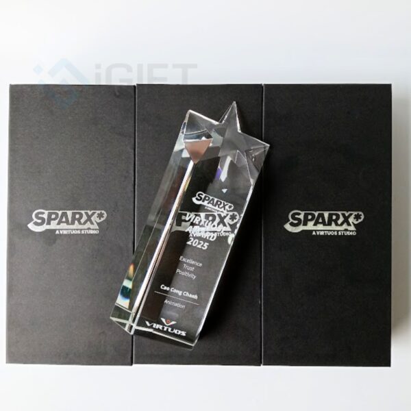 Kỷ niệm chương được chế tác từ thủy tinh cao cấp, trong suốt và sáng bóng, tạo nên vẻ đẹp sang trọng và hiện đại. Chất liệu thủy tinh không chỉ mang đến cảm giác trang nhã mà còn giúp tôn vinh tối đa các chi tiết thiết kế, tạo hiệu ứng ánh sáng nổi bật, phản chiếu thông điệp của doanh nghiệp một cách ấn tượng. Đế thủy tinh chắc chắn, đồng bộ với tổng thể thiết kế, làm tăng thêm sự uy nghiêm và giá trị thẩm mỹ cho sản phẩm.