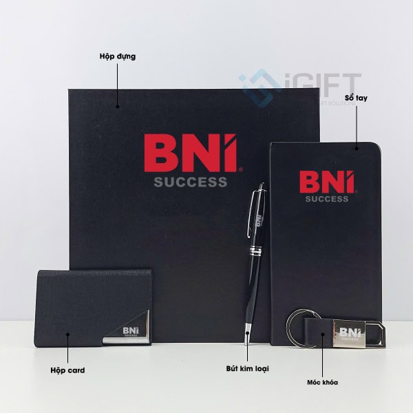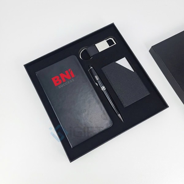Bộ quà gồm 4 sản phẩm thiết thực trong môi trường làm việc: sổ tay bìa da PU, bút ký, hộp đựng card và móc khóa. Mỗi vật phẩm đều có thể sử dụng hàng ngày, giúp hình ảnh thương hiệu luôn xuất hiện trong tầm mắt người nhận. Với thiết kế sang trọng, đồng bộ, đây là lựa chọn lý tưởng cho các chương trình tri ân, hội thảo, sự kiện doanh nghiệp.