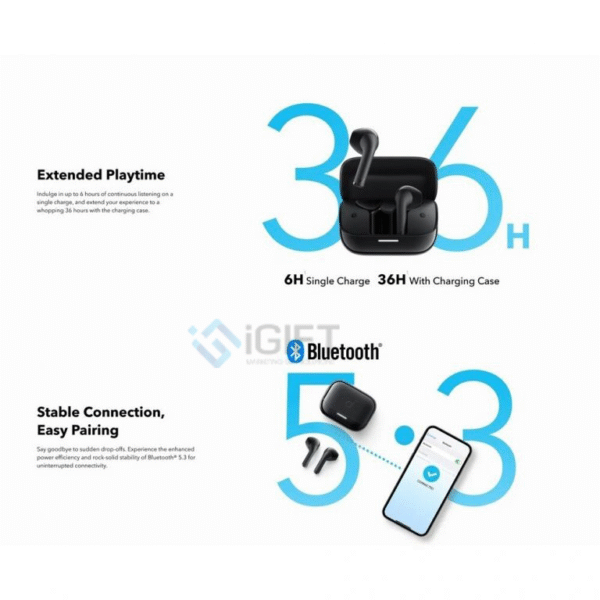 - Thời gian Sử dụng lâu dài: Tai nghe cung cấp thời gian nghe nhạc lâu dài với mỗi lần sạc và đi kèm với một hộp sạc tiện lợi để gia tăng thời gian sử dụng tổng thể.