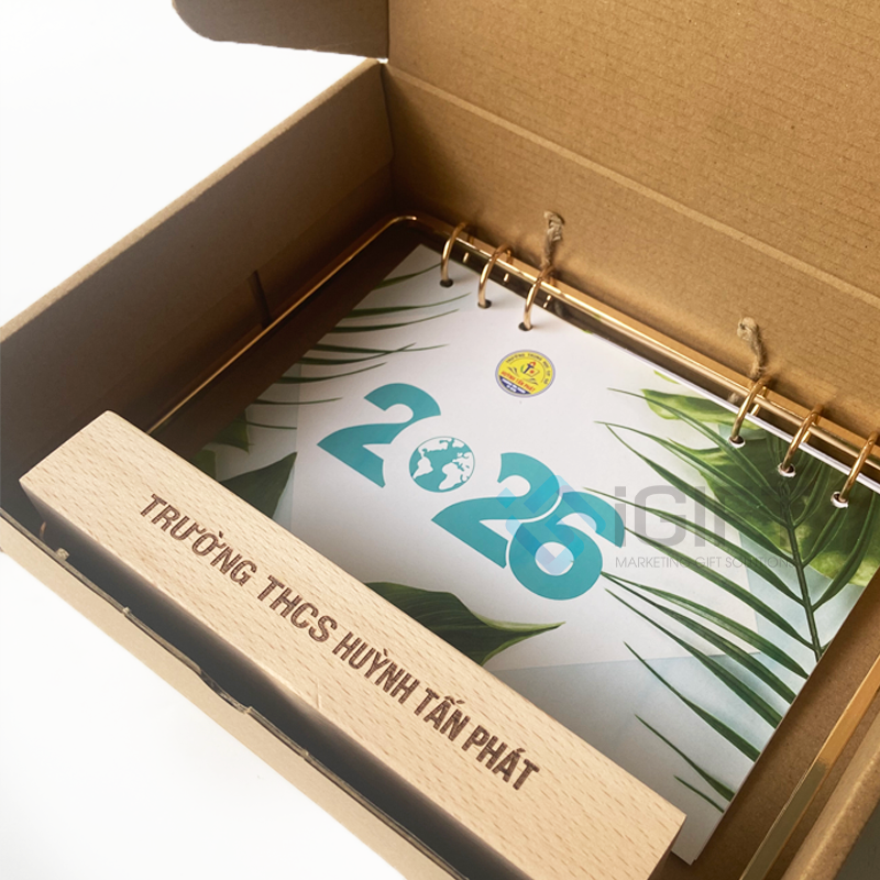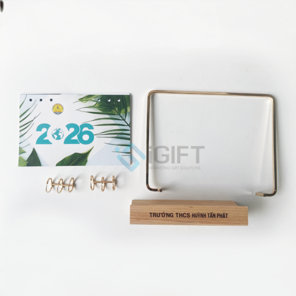 Phần đế gỗ kích thước 18.2x6x3cm có màu vàng nhạt tự nhiên của gỗ sồi, nổi bật khi khắc logo thương hiệu trực tiếp bằng công nghệ laser. Tờ lịch kích thước 21.5x14cm, gồm 13 tờ (12 tháng và 1 tờ thiết kế riêng), cho phép doanh nghiệp tùy chỉnh hình ảnh, nội dung và nhận diện thương hiệu.