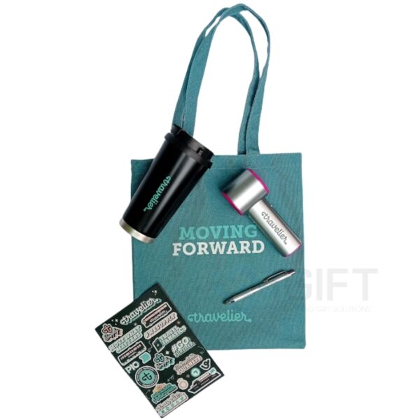 Bộ quà tặng tiêu chuẩn gồm quạt điện cầm tay, bút bi, túi vải canvas, sổ bìa da, ly giữ nhiệt và hộp quà tặng. Mỗi vật phẩm đều có tính ứng dụng cao trong đời sống và công việc, giúp thương hiệu hiện diện tự nhiên, không phô trương nhưng hiệu quả.